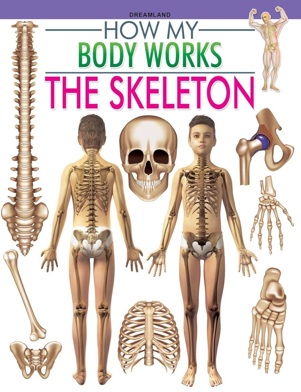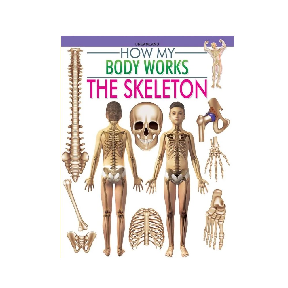A book explaining human skeletal structure. Covers bone functions; Includes illustrations; Educational content for kids.